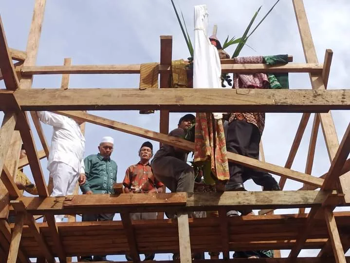 Persiapan diawali dengan musyawarah untuk menentukan hari baik, diikuti dengan pengumpulan bahan. Pada hari pelaksanaan, pemasangan tiang utama hingga kerangka atap dilakukan oleh para tukang yang ahli, namun seluruh masyarakat berpartisipasi dalam menyediakan logistik dan dukungan moral. Puncak ritualnya adalah saat kerangka atap utama diposisikan dan dikunci.